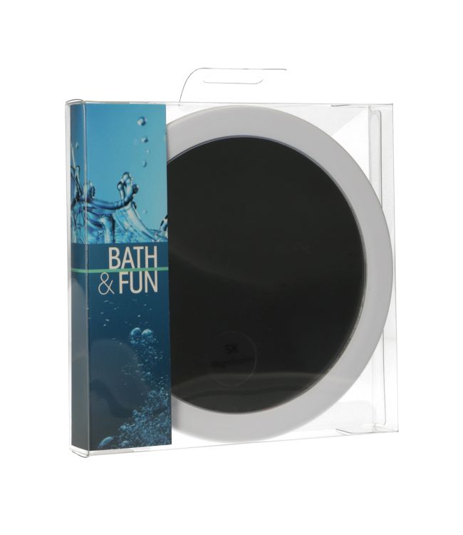 Badkamerspiegel met Zuignap 5x vergrotend is een spiegel die aan de wand kan worden opgehangen doormiddel van een zuignap. Deze badkamerspiegel is 5x vergrotend. De afmeting van deze spiegel is 15,4cm lang - 3cm breed - 15,4cm hoog - diameter 14cm. De spiegel is gemaakt van kunststof en is verkrijgbaar in de kleuren transparant en wit.