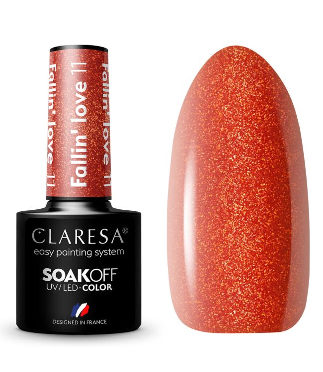 Claresa UV/LED Gellak 5ml Fallin' Love 11 is een gel nagellak in een dieprode koper kleur met gouden glitter finish uit de Fallin' Love collectie van Claresa. De Fallin' Love collectie haalt herinneringen aan de zomer op en geeft de herfst een warm welkom. De verschillende nude tinten kunnen gemakkelijk afgestemd worden op de huidskleur en/of haarkleur en benadrukken een zomers tintje. Fallin' Love is perfect voor een romantische manicure. De kleuren zijn mooi op zichzelf, maar ook perfect om te combineren met andere tinten in nail-art designs. Fallin' Love 11 is een warme herfstrode kleur met gouden glitters die prachtig sprankelen. Perfect als gedurfde basiskleur of om details toe te voegen aan rustige nude kleuren.