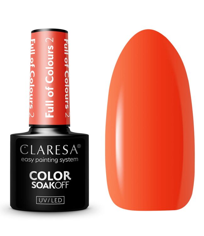 Claresa UV/LED Gellak 5ml Full Of Colours 2 is een gel nagellak in een warm rode kleur uit de Full Of Colours collectie van Claresa. De Full Of Colours collectie weerspiegelt de energie van de zomermaanden met door de zon verwarmde stranden, verkoelend zeewater, rijp zomerfruit en geluiden van festivals en concerten in de openlucht. De ongedwongen zomerse sfeer komt terug in een collectie met 7 levendige en gepigmenteerde tinten die samen een zomerse regenboog creëren. Full Of Colours 2 is geïnspireerd door de kleur van rode klaprozen. Deze klassieke, warm rode tint voert je mee naar een zorgeloze zomer.