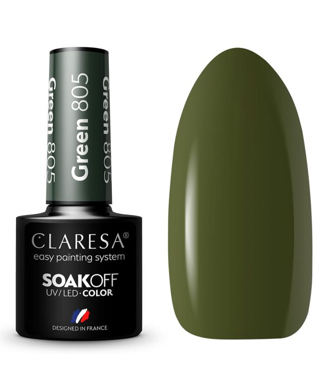 Claresa UV/LED Gellak 5ml Green 805 Take Me To The River is een donkergroene kleur uit de Take Me To The River collectie van Claresa. Take Me To The River heeft een uitgebreide mix aan kleuren geïnspireerd door de natuur. De frisse en elegante kleuren vergezellen je tijdens een zomerse picknick langs de oevers van de rivier. Take Me To The River Green 805 is een donkere, army green kleur die doet denken aan de dichte bomen langs de rivier. De kleur is prachtig op zichzelf, maar ook perfect te combineren met andere tinten voor nail-art designs.