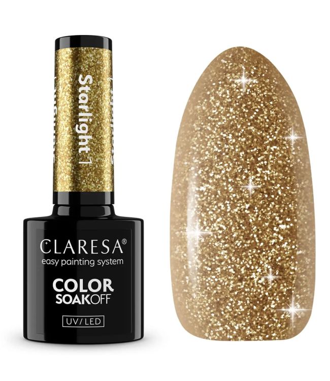Claresa UV/LED Gellak 5ml Starlight 1 is een gel nagellak in een gouden kleur met flash-effect uit de Starlight collectie van Claresa. Starlight is geïnspireerd op een hemel vol met glinsterende sterren. Starlight 1 is een gouden kleur die bomvol zit met 3D-glitters. Bij daglicht glinsteren de deeltjes zachtjes, maar in kunstlicht, direct flitslicht of zonlicht krijgt de kleur een hypnotiserend 3D-effect. Verander elke styling in een spotlight die de aandacht trekt!
