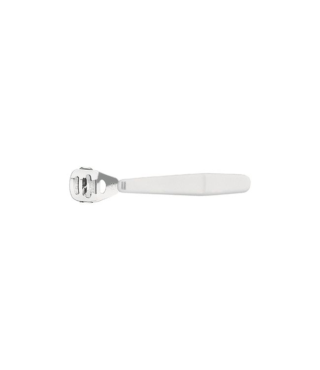Het bijgevoegde mesje kan aan beide kanten worden gebruikt en moet worden omgedraaid en vervangen zoals gemeld in de gebruiksaanwijzing. Na gebruik van het eeltmes navijlen met een keramische voetvijl om de kleine hoeveelheden te verwijderen.