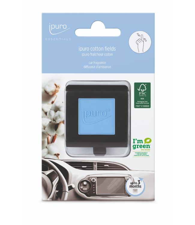 Ipuro Car Line Cotton Field is een blokje wat kan worden opgehangen in de auto. Dit blokje geeft een heerlijke en poederachtige geur met een vleugje vanille af. De Ipuro Car Line geeft lang een heerlijke geur af en is makkelijk in gebruik. De nieuwe ipuro car lijn is 90% bio based en heeft een FSC gecertificeerde verpakking.